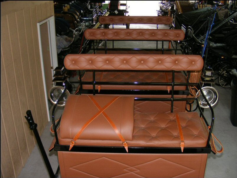 Roof Seat Break, Superb Craftsmanship. Wicker basket, copper lined ice box, two pull-out cabinets trimmed in brass, pull-out shelf in door, front and rear disc brakes and hand brake. Available in all colors.